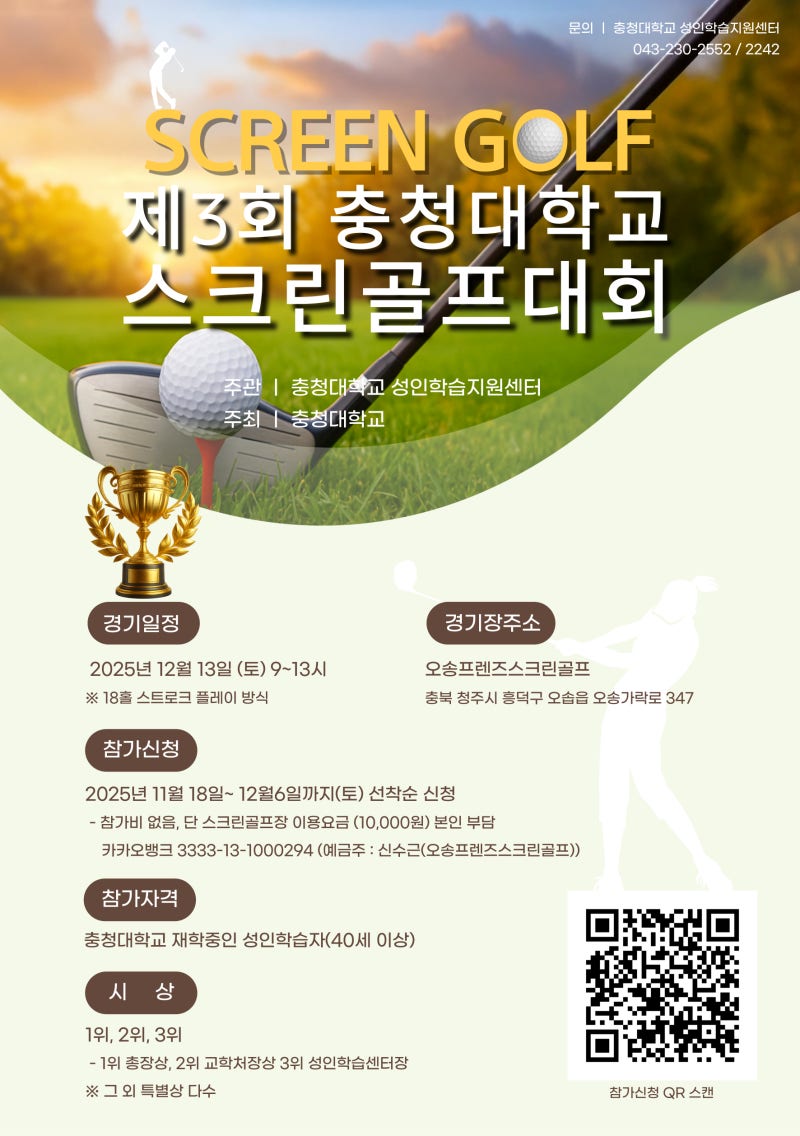 안녕하세요. 제3회 충청대학교 총장배 스크린골프대회 공지드립니다.